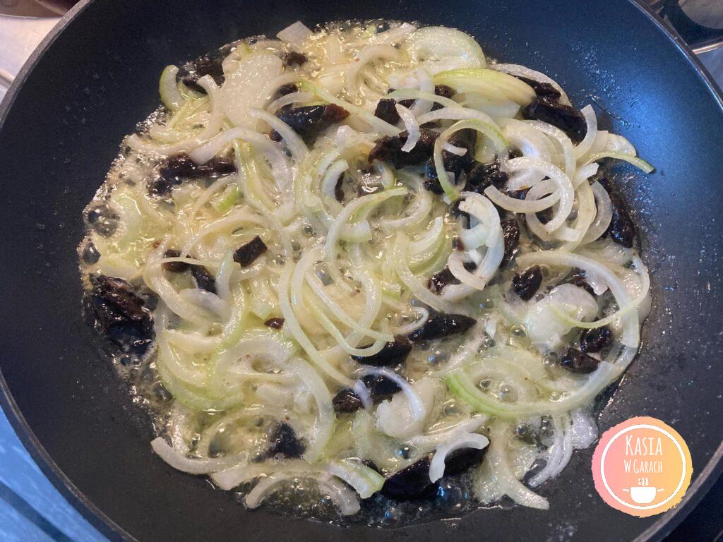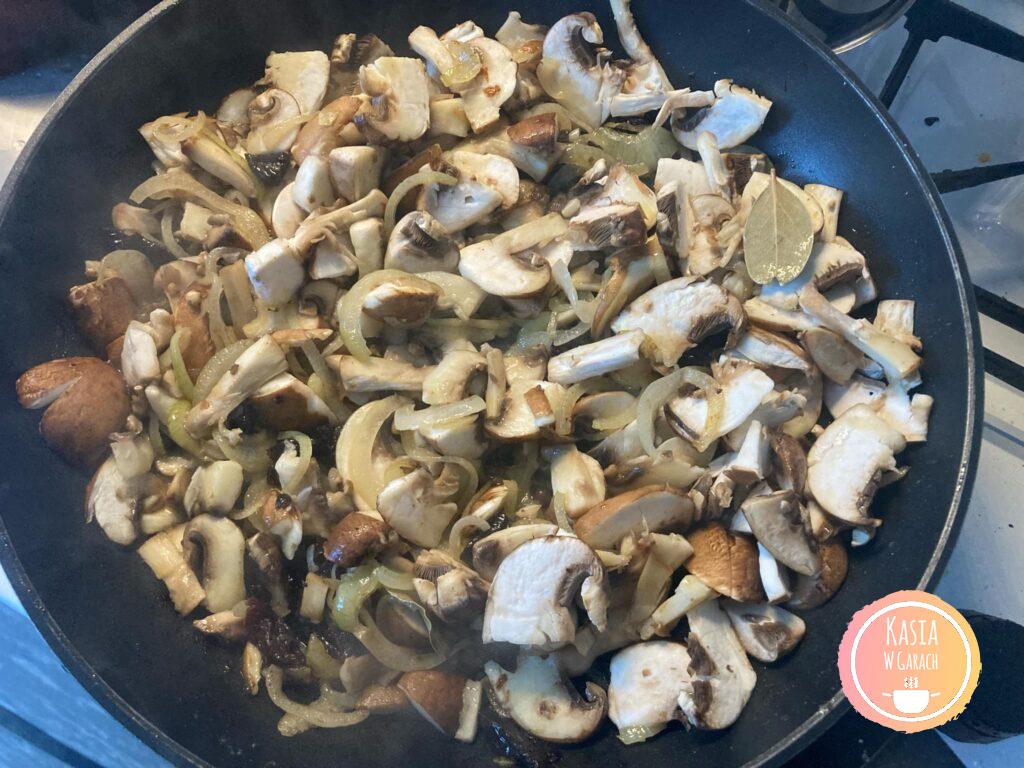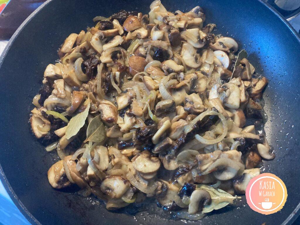 - na patelni na maśle z olejem przesmażamy cebulę wraz z liśćmi laurowymi oraz zielem angielskim. Gdy się zeszkli dodajemy śliwki chwilę przesmażamy. Następnie dokładamy pieczarki. Solimy, oraz pieprzymy i smażymy kilka minut co jakiś czas mieszając dopóki woda z pieczarek nie wyparuje.