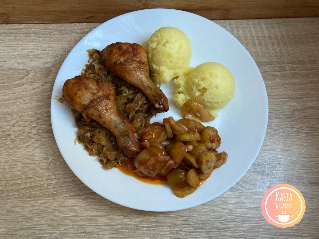 - Pieczone udka z kurczaka po zbójnicku podałam z ugotowanymi ziemniakami i swojskimi ogórkami w pomidorach.