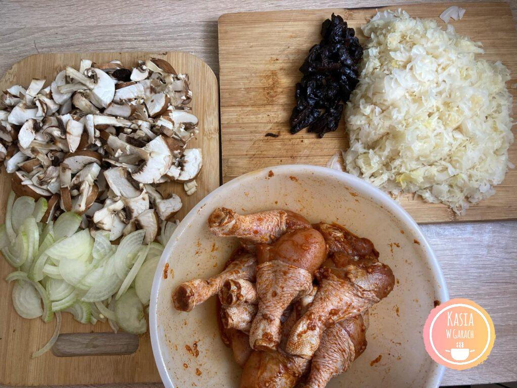 - W międzyczasie szykujemy dodatki. Obraną cebulę kroimy w półplasterki. Umyte i osuszone pieczarki kroimy w plasterki bądź półplasterki. Odcedzoną kapustę rozdrabniamy nożem, suszone śliwki kroimy w paseczki.