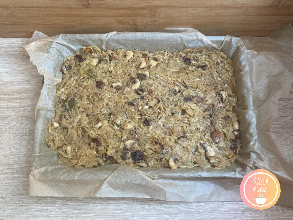 - Gorącą kapustę wykładamy na dno naczynia żaroodpornego lub blaszkę wyłożoną papierem do pieczenia. Równomiernie rozprowadzamy po całej powierzchni
