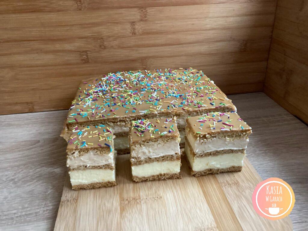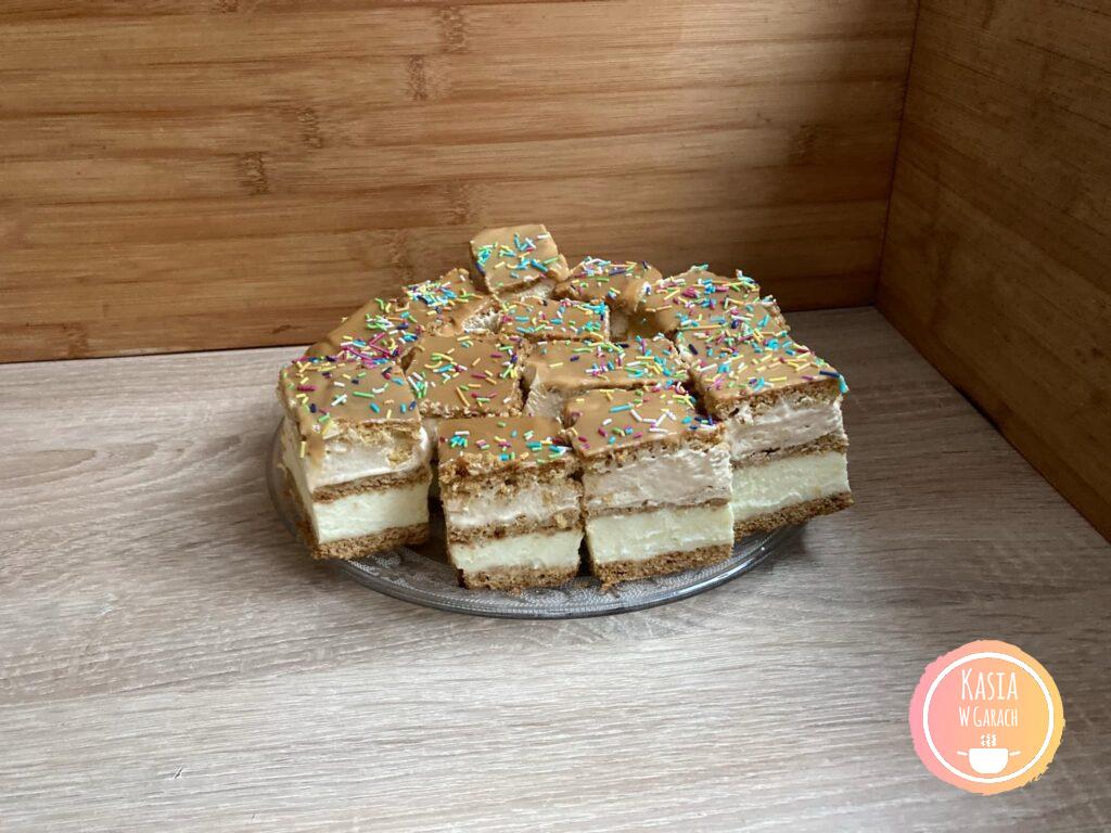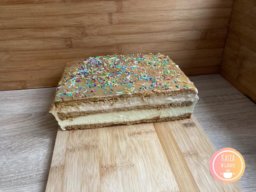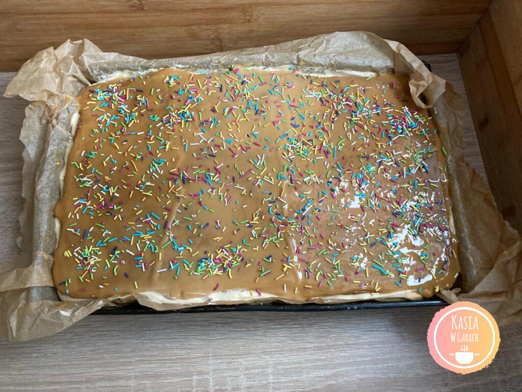 - Po tym czasie wyciągnęłam z lodówki, rozsmarowałam pozostały kajmak po wierzchu i posypałam posypką.