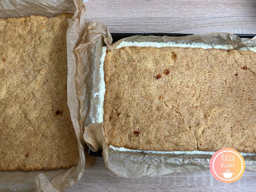 - pieczemy po kolei trzy blaty w blaszce ( ja użyłam o wymiarach 30×26 cm) wyłożonej papierem do pieczenia w temperaturze 170-180 stopni, do momentu aż ładnie się zrumienią.