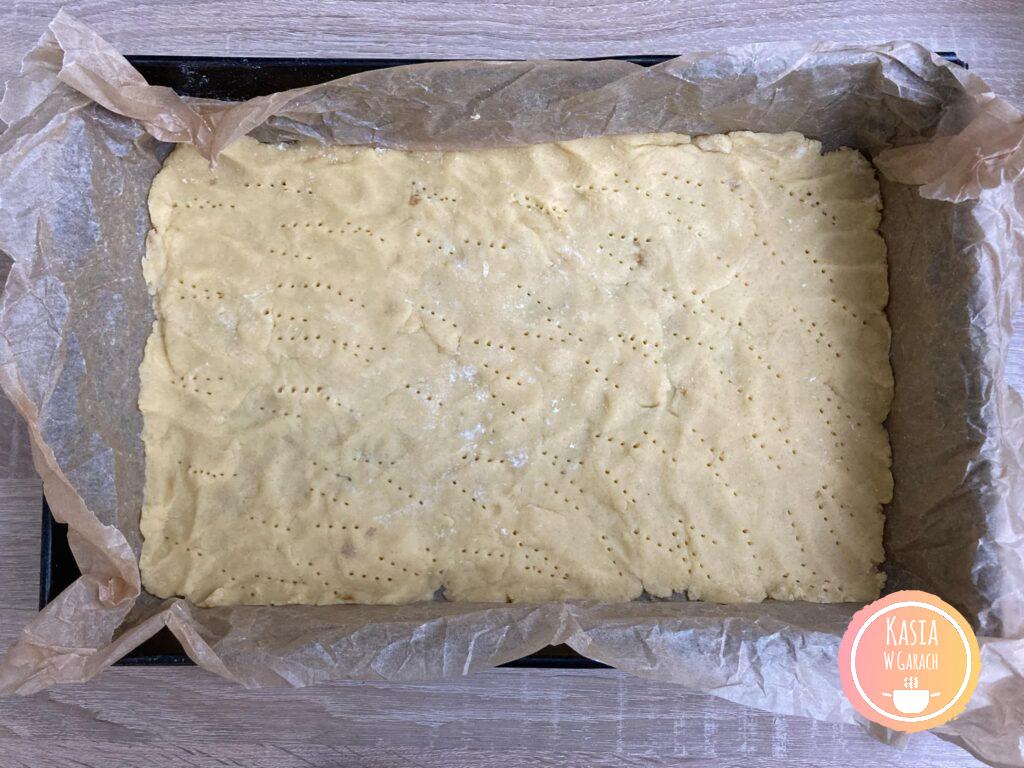 - Na spód blachy wyłożonej papierem do pieczenia układamy pierwszy kruchy spód. Po nim rozprowadzamy masę budyniową. Przykrywamy drugim blatem ciasta lekko dociskając go do masy.