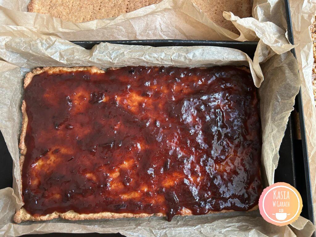 - składanie ciasta: Na spód blachy wyłożonej papierem do pieczenia układamy pierwszy kruchy spód. Po nim rozprowadzamy powidła śliwkowe. Przykrywamy drugim blatem ciasta lekko dociskając go do dżemu.