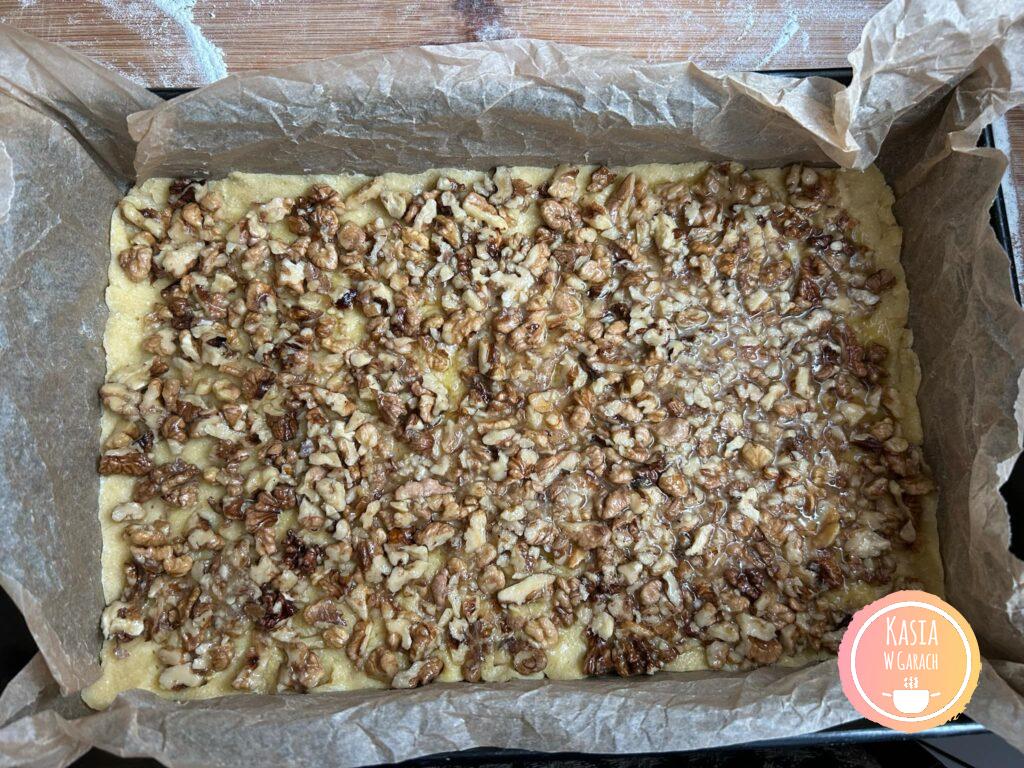 - W międzyczasie siekamy orzechy. Na patelni rozpuszczamy masło z miodem i cukrem. Dodajemy posiekane orzechy i dokładnie mieszamy aby powstały syrop dobrze połączył się z orzechami. Na jedno surowe ciasto wykładamy i równomiernie rozprowadzamy orzechy,.