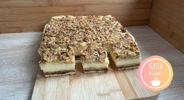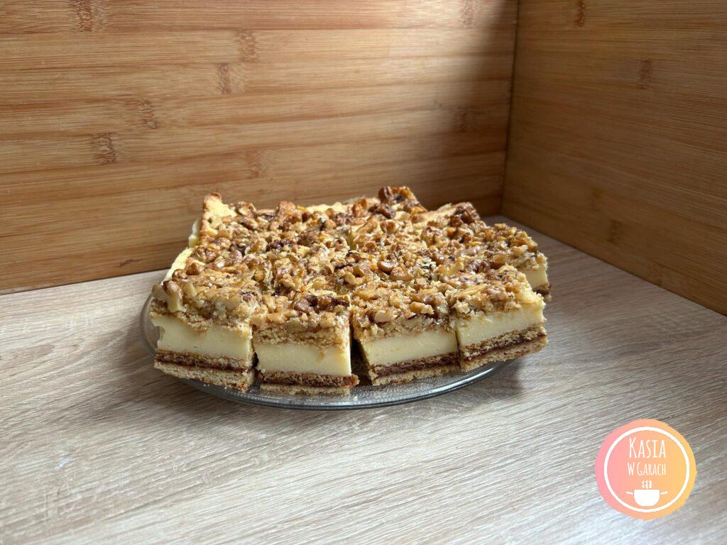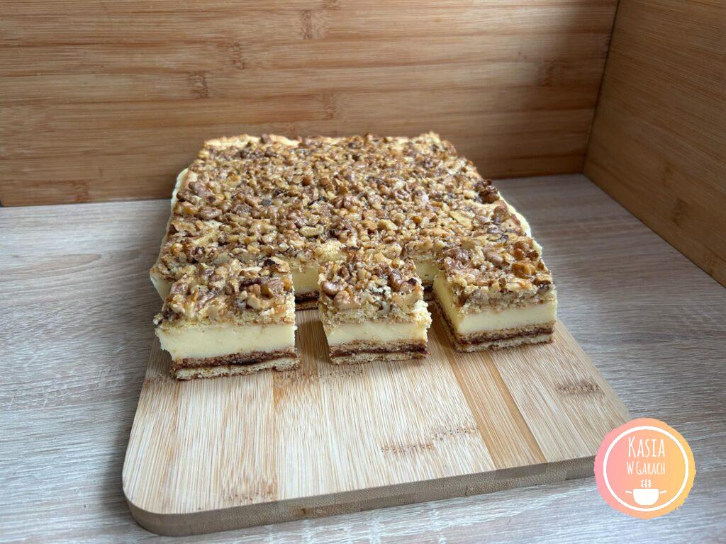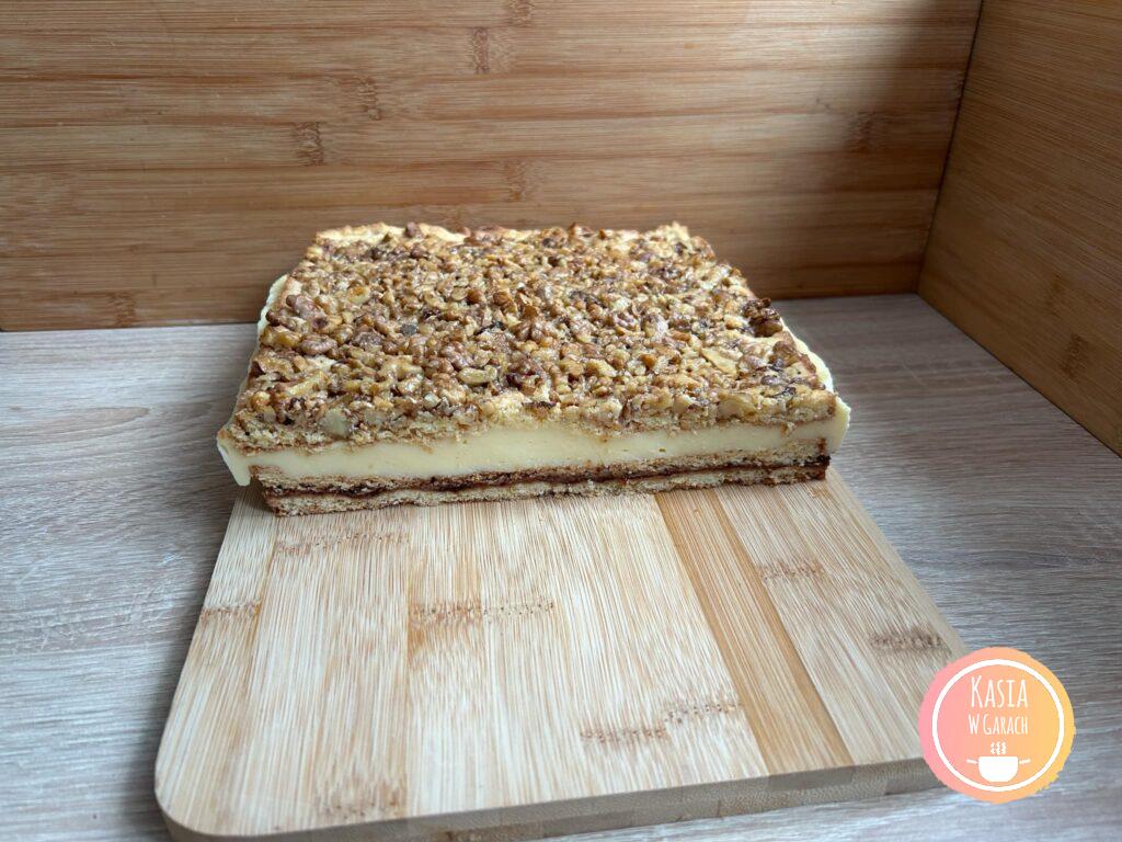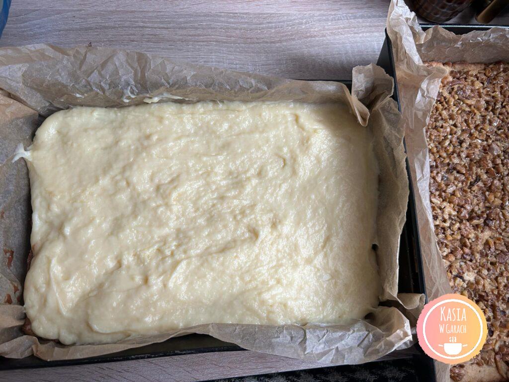 - Gotową gorącą masę budyniową wykładamy i rozprowadzamy po cieście. Przykrywamy trzecim blatem ciasta z orzechami lekko dociskając.