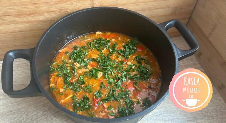 - przesmażoną cebulę z papryką przekładamy do garnka. Całość zalewamy bulionem/rosołem. Gotujemy na małym gazie co jakiś czas mieszając aż papryka będzie miękka.