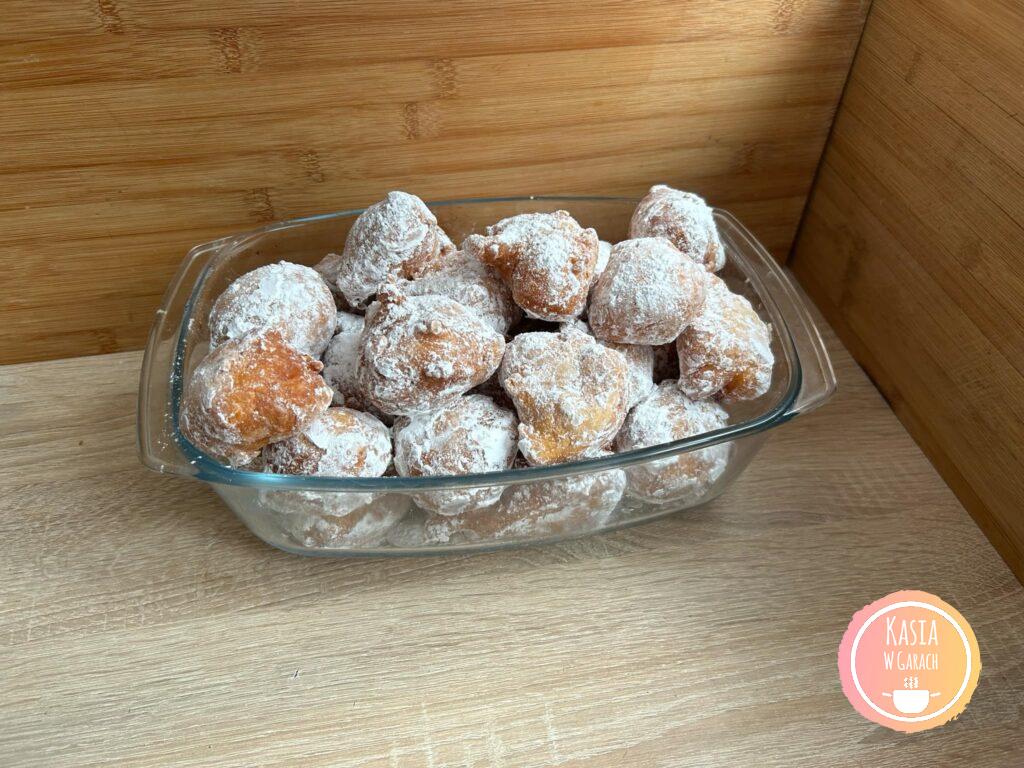 - usmażone jeszcze ciepłe pączuszki obtaczamy w cukrze pudrze.