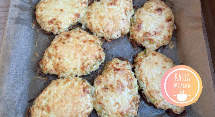 - usmażony schab wykładamy na blachę od piekarnika wyłożoną papierem do pieczenia. Na każdym plastrze wykładamy i równomiernie rozprowadzamy porowy farsz i posypujemy żółtym serem,