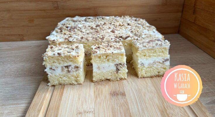 - batoniki waflowe siekamy, jeden drobno posiekany wafelek odkładamy do posypania wierzchu ciasta. Dwa dodamy do masy.