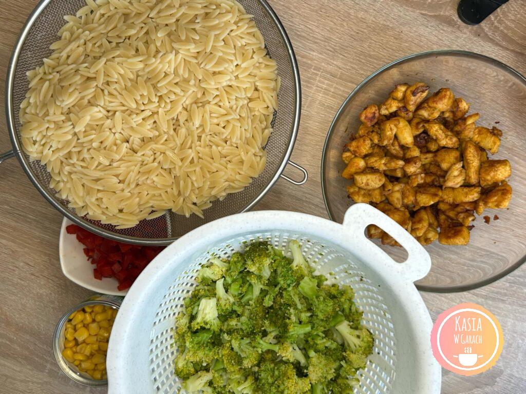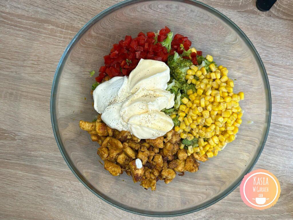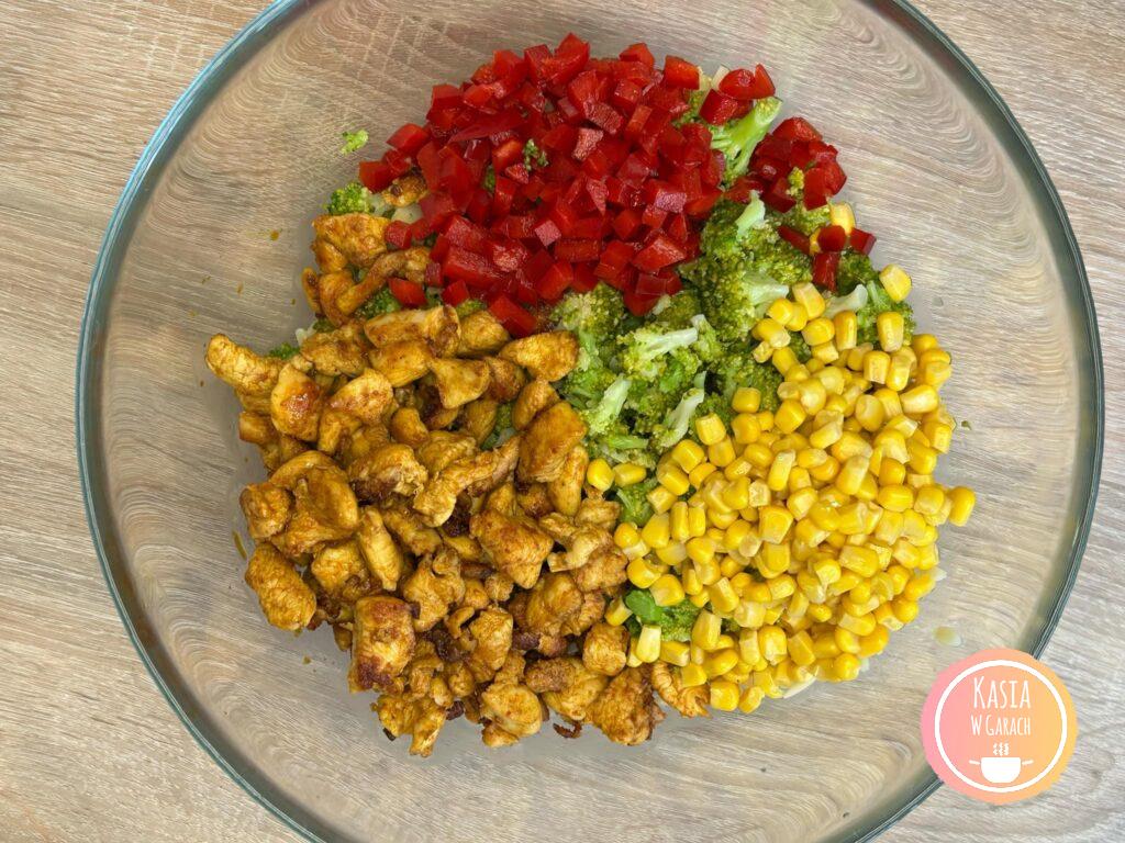 • Do dużej miski przekładamy odcedzony makaron oraz brokuły. wsypujemy pozostałe składniki.