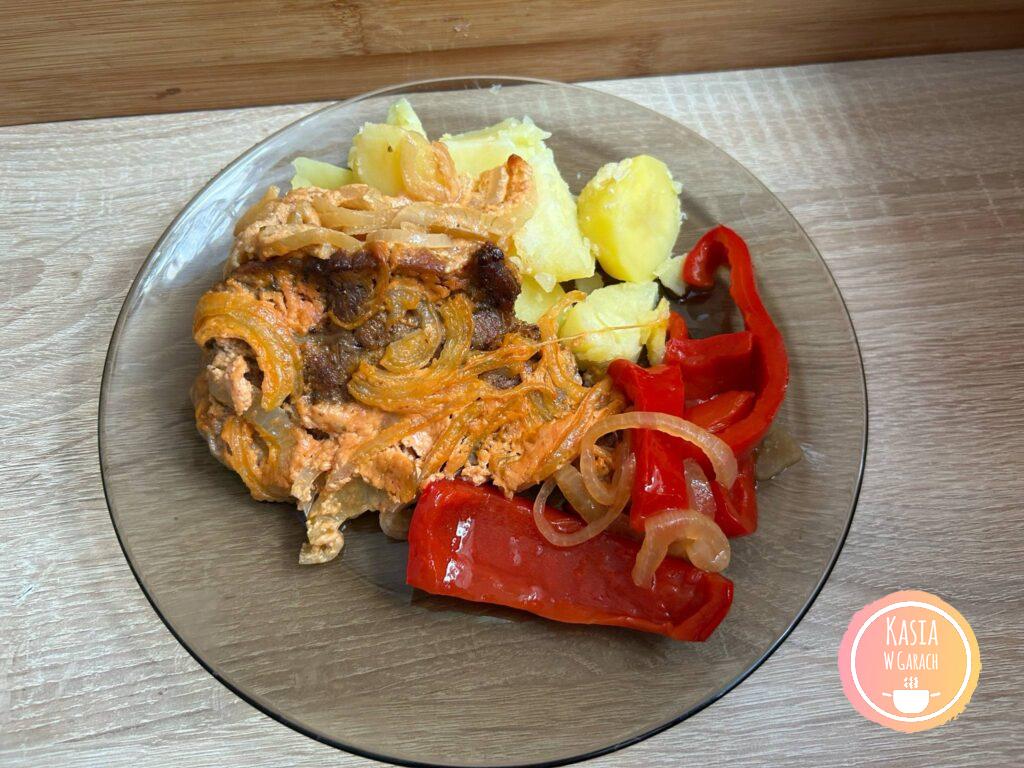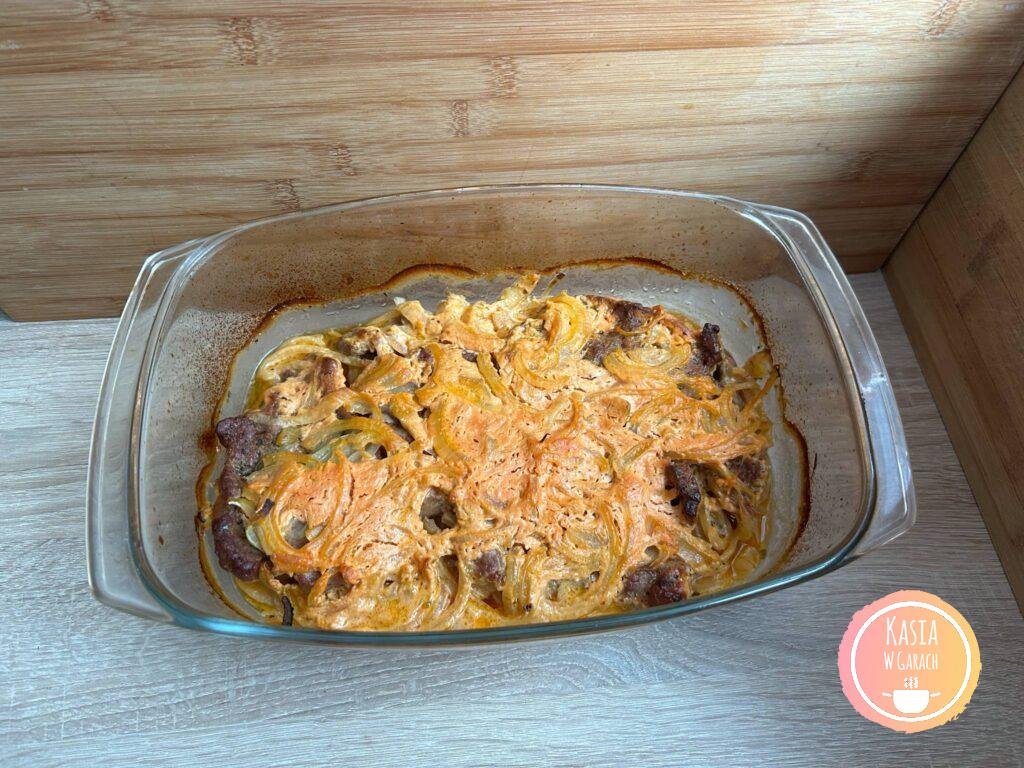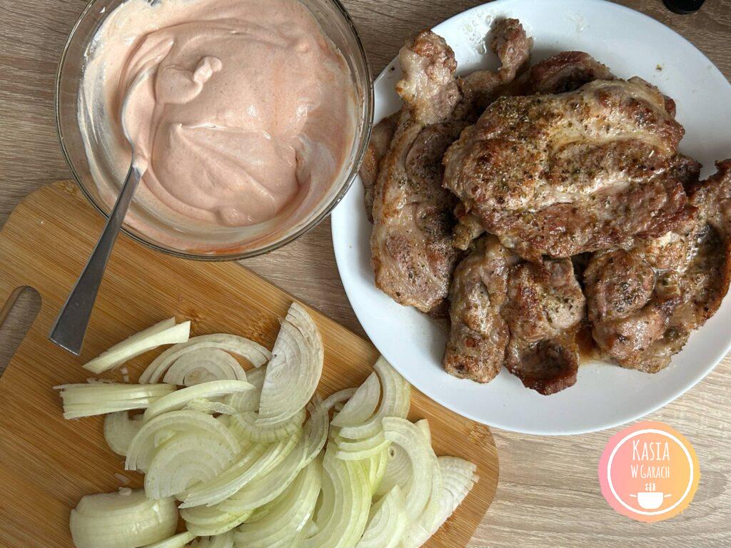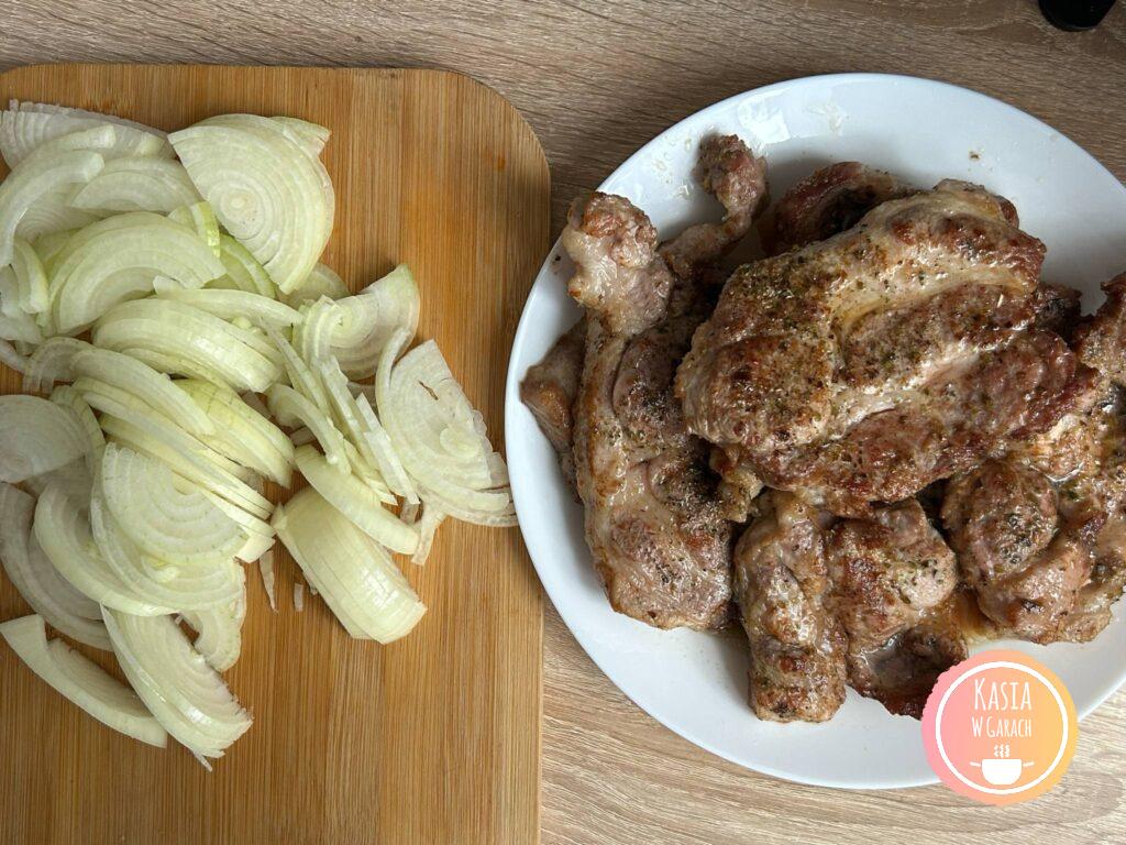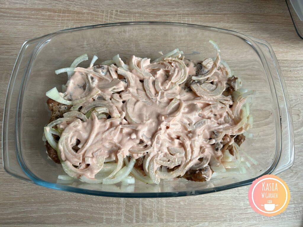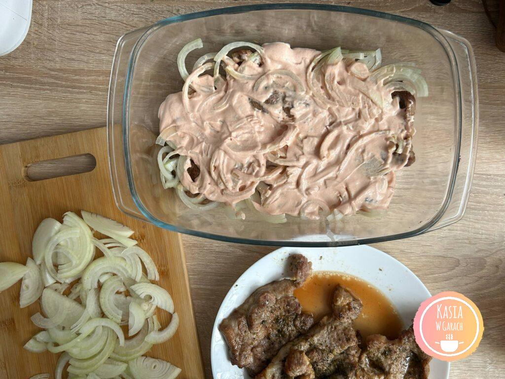 - Na dno naczynia żaroodpornego wykładamy warstwę karkówki, posypujemy połową cebuli i rozprowadzamy po mięsie połowę sosu.