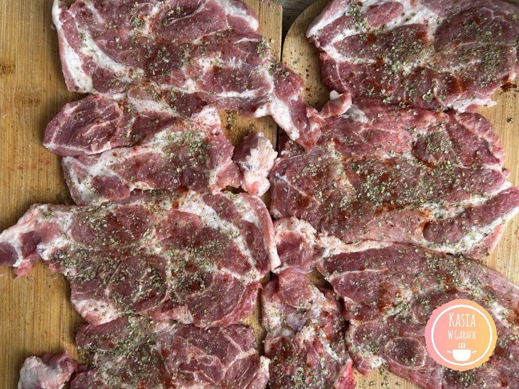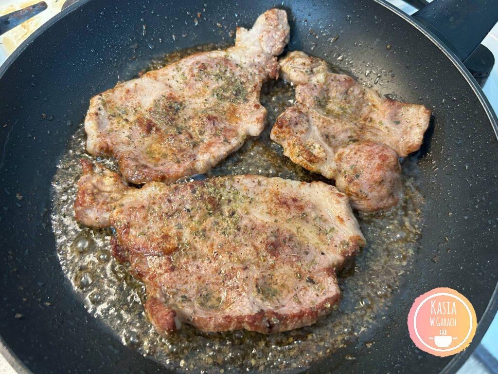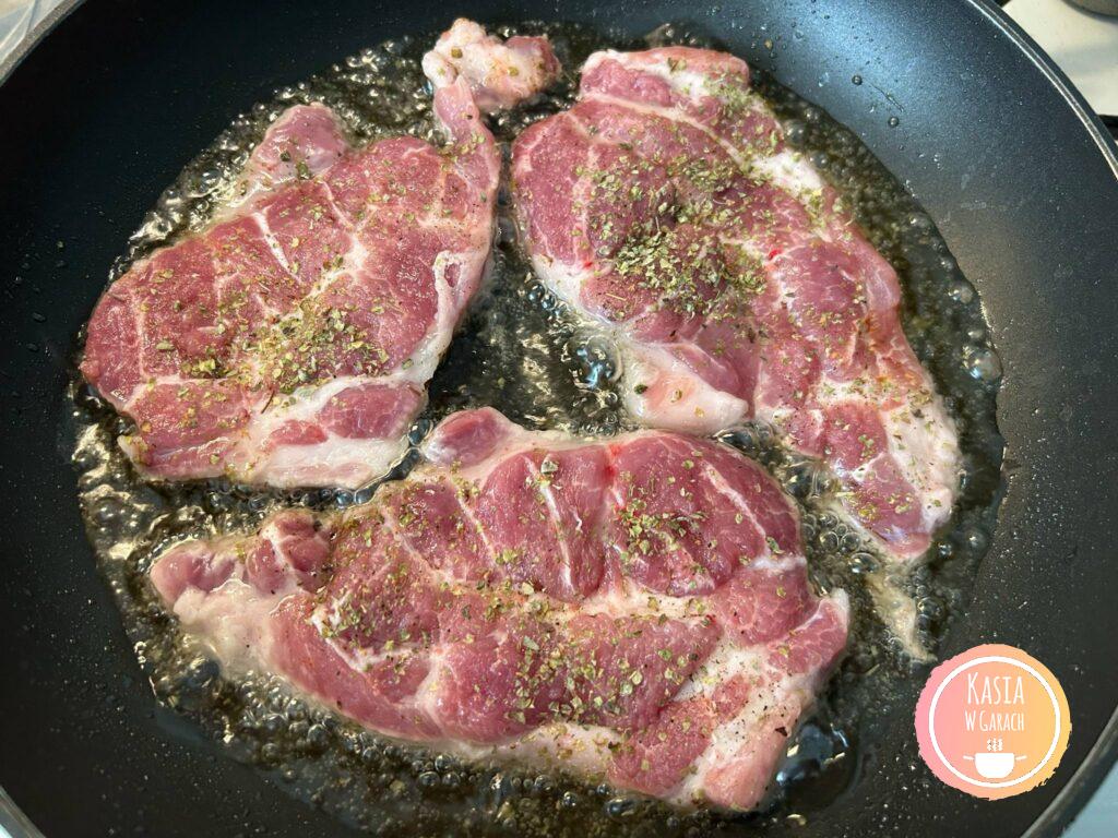 - mięso z obu stron oprószamy przyprawami i obsmażamy na rumiano na tłuszczu.