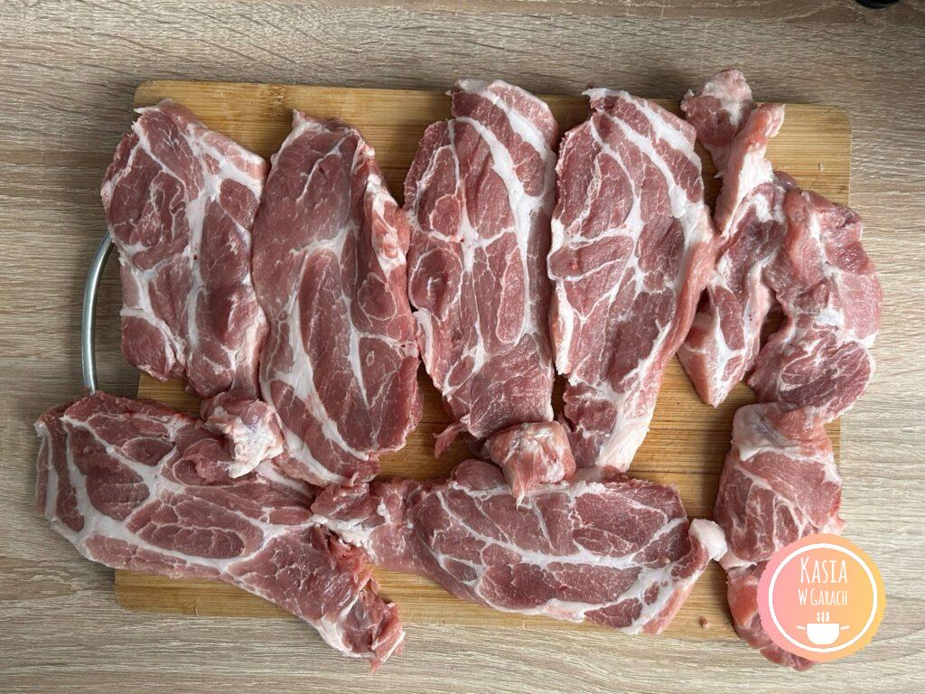 - Karkówkę kroimy w ok 1 cm plastry i lekko rozbijamy tłuczkiem.