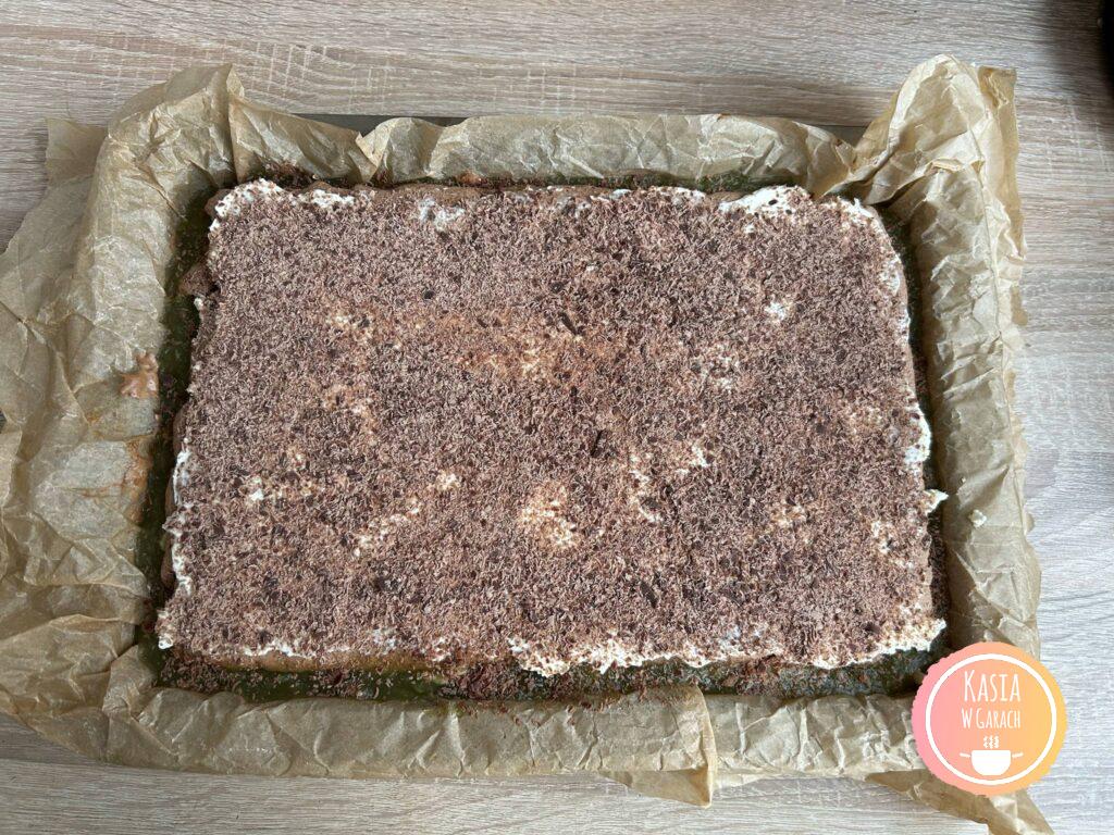 • Po wierzchu rozsmarowujemy pozostałą masę i posypujemy startą czekoladą.