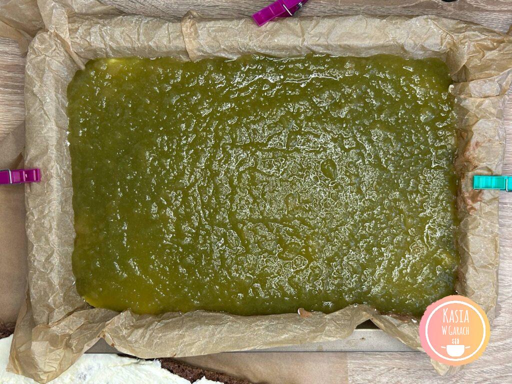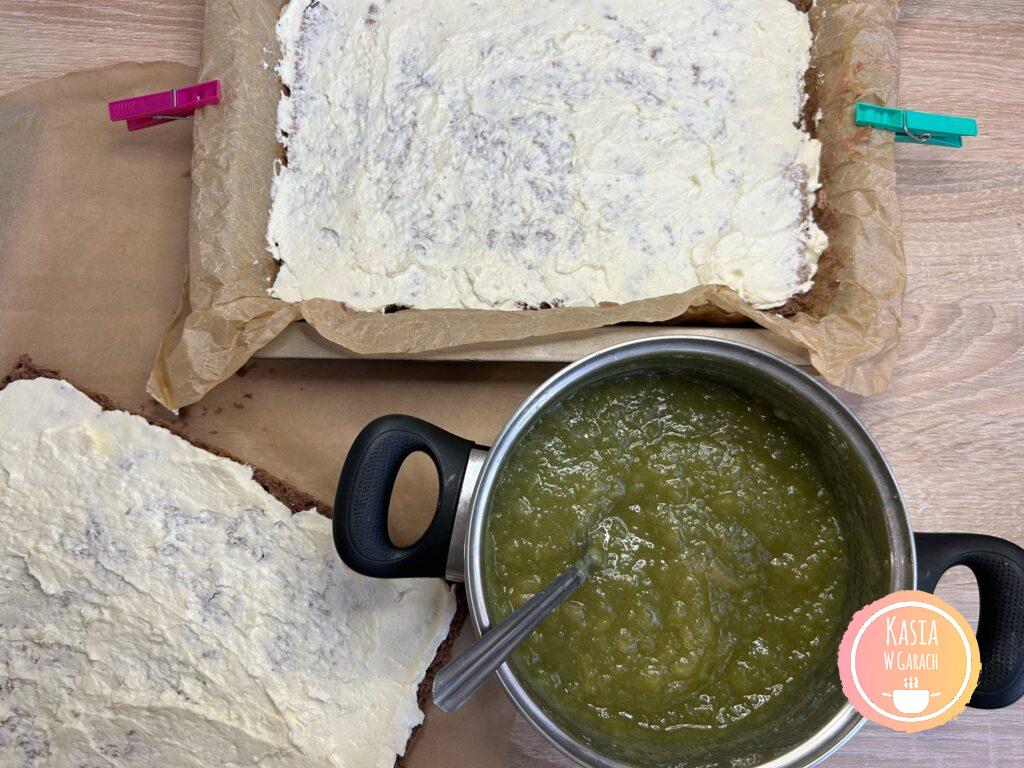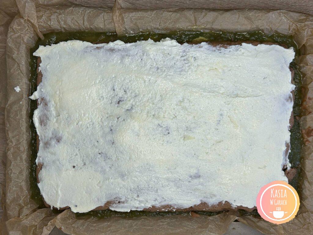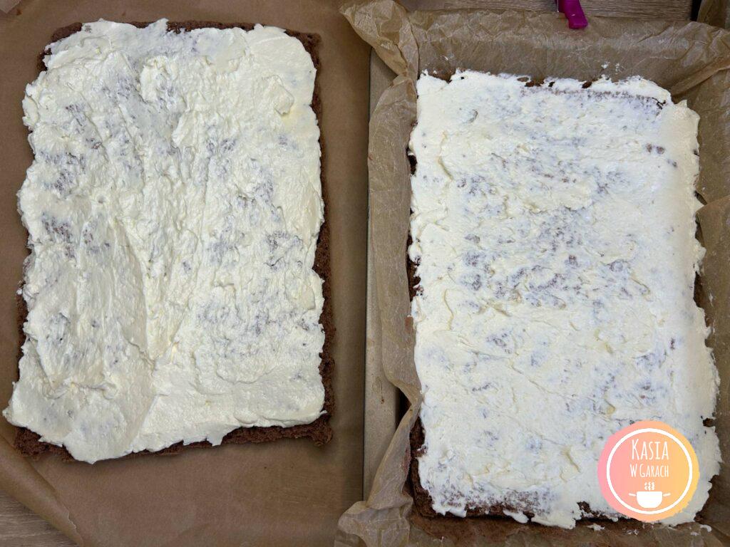 • Na spodzie ciasta rozsmarowujemy 1/3 masy. Na drugim spodzie kolejna 1/3.
