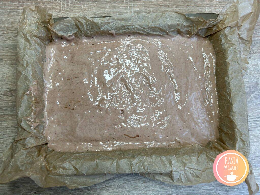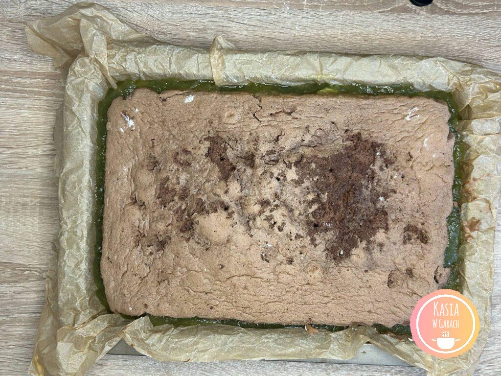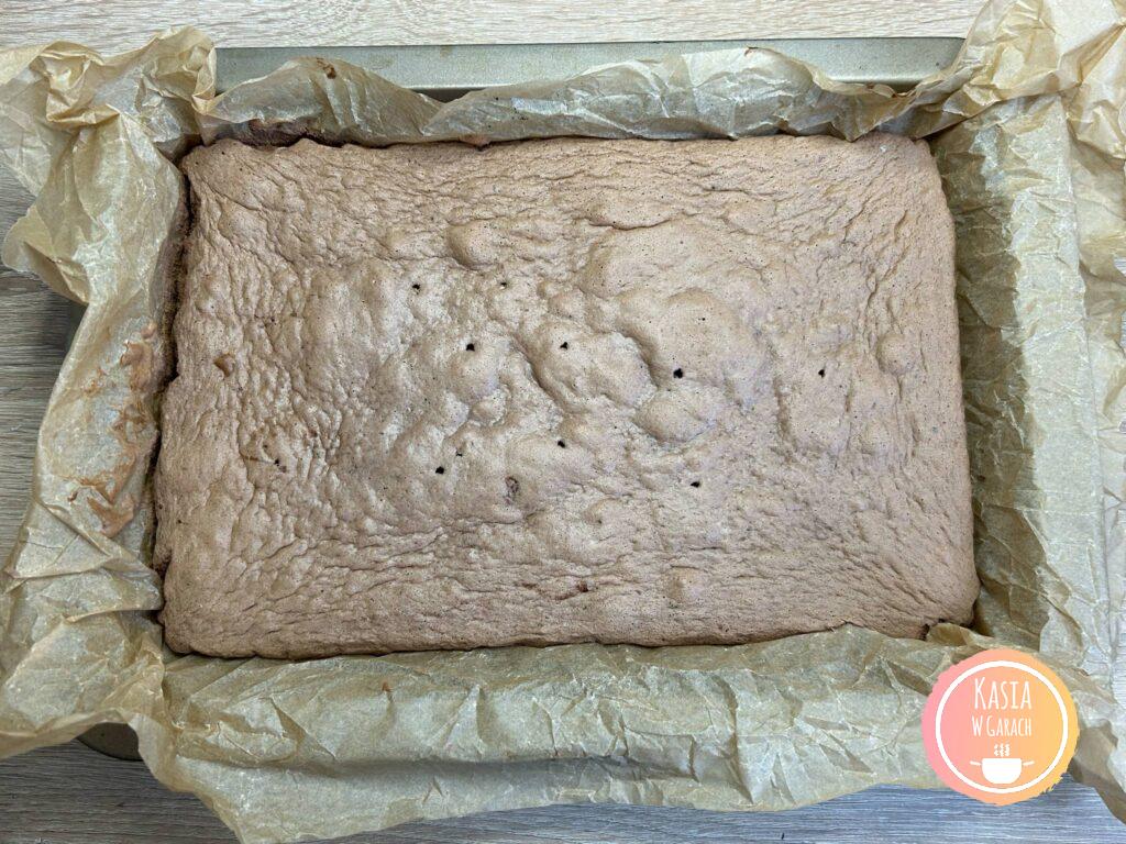 • upieczenie biszkoptu: białka wraz ze szczyptą soli ubijamy na sztywną pianę, pod koniec ubijania dodajemy cukier, gdy piana będzie sztywna i lśniąca cały czas miksując dodajemy po jednym żółtku, następnie cały czas miksując wlewamy olej. Dodajemy mąkę wraz z proszkiem do pieczenia i kakao. Mieszamy krótko tylko do połączenia się składników. Gotowe ciasto przelewamy do blachy o wymiarach 31×21 cm wyłożonej papierem do pieczenia i wstawiamy do piekarnika nagrzanego do 180 stopni (góra-dół), pieczemy ok 30 min do suchego patyczka. Upieczone ciasto odstawiamy do całkowitego ostygnięcia.