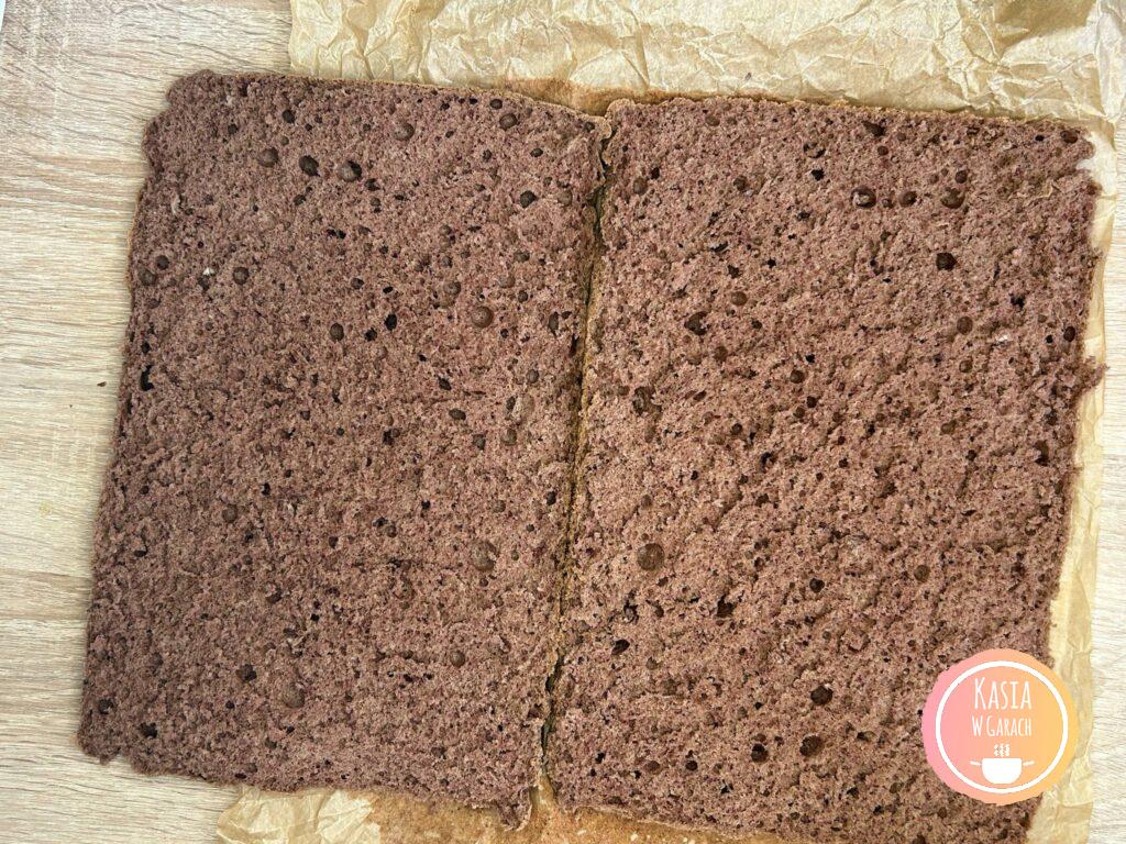 • Ostygnięty biszkopt wyciągamy z blaszki, przekrawamy na pół. Jedną połowę biszkoptu wkładamy ponownie do blachy wyłożonej papierem do pieczenia.