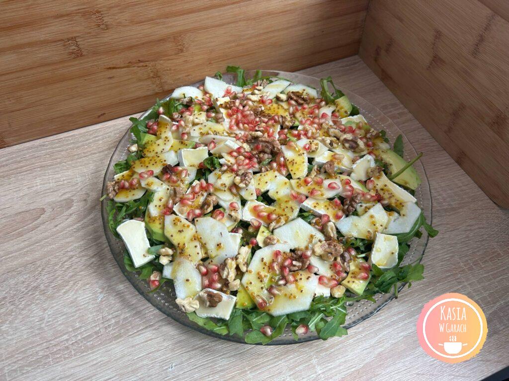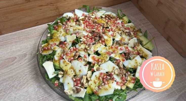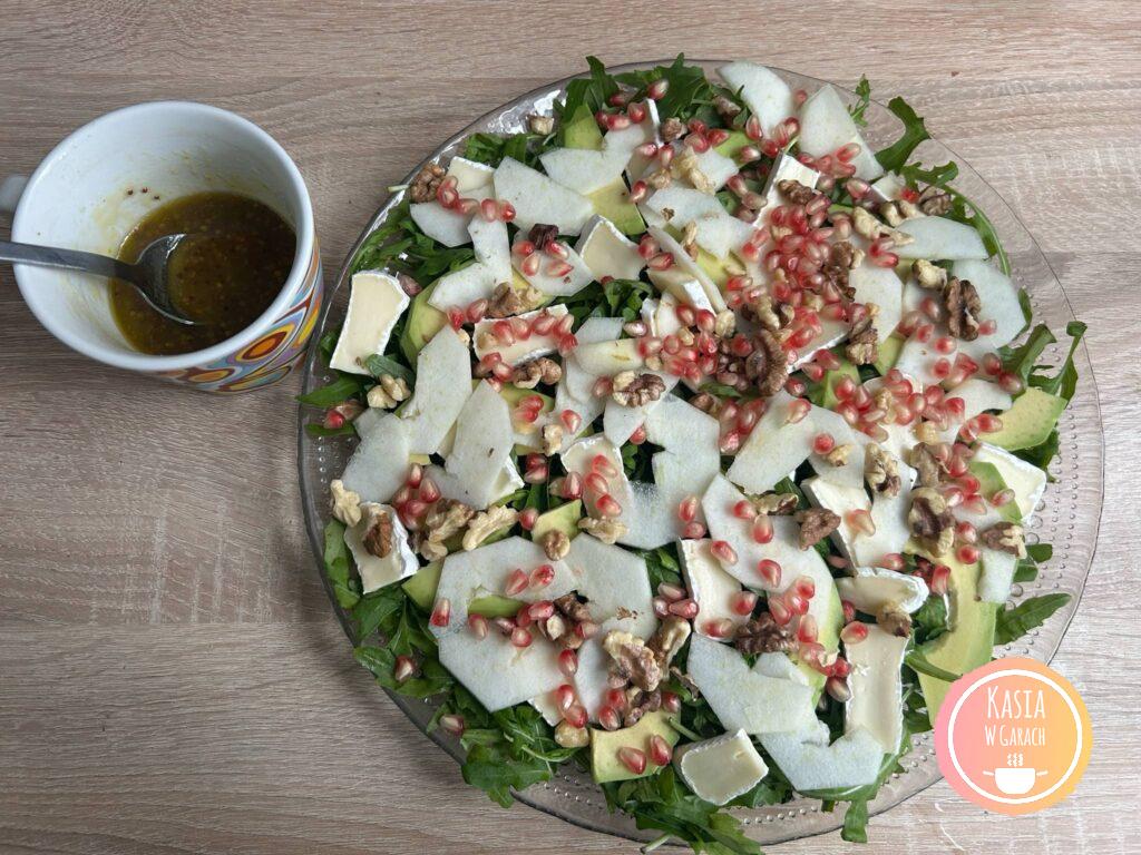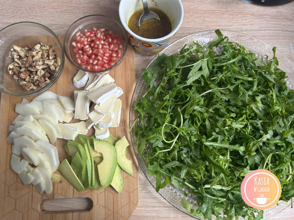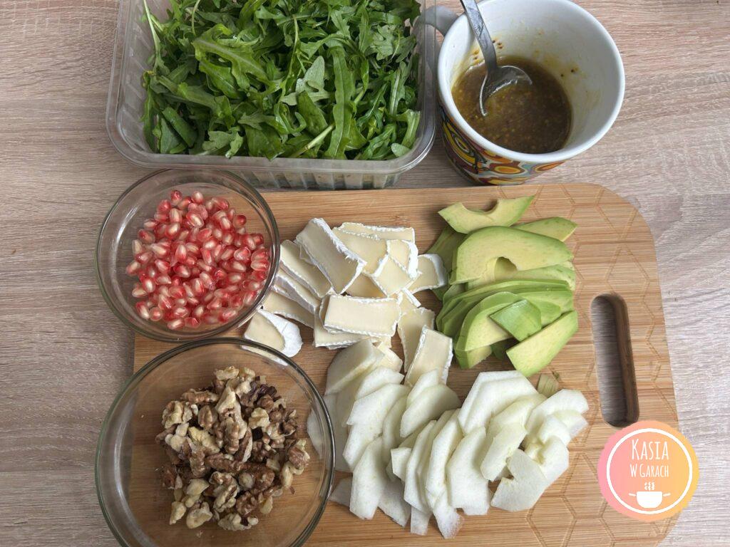 - Na duży talerz lub półmisek wykładamy rukole, następnie układamy równomiernie ser, avocado oraz gruszkę. Posypujemy orzechami oraz granatem.