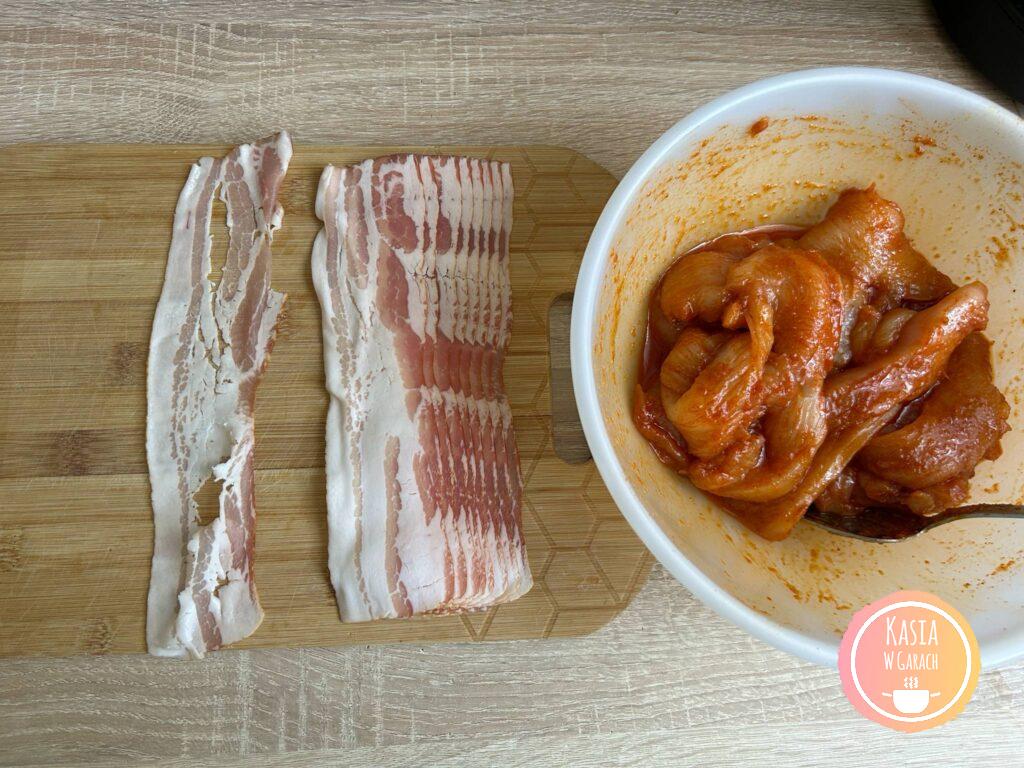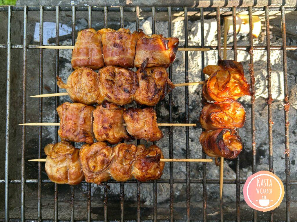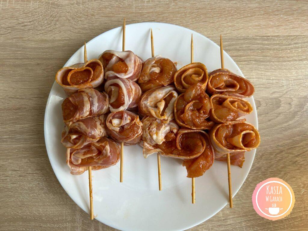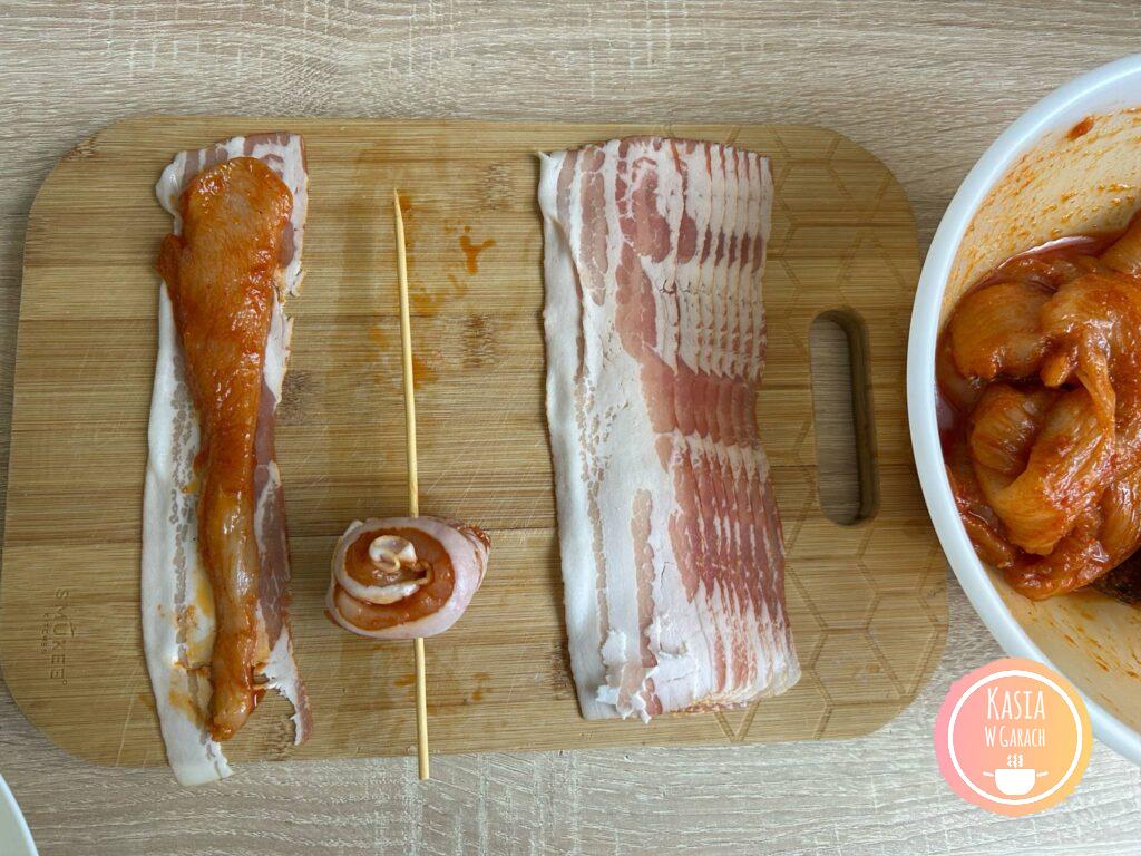 - Na plasterek boczku kładziemy pasek kurczak i zwijamy. Nadziewamy na patyki. – Pozostałą marynata smarujemy zawijasy pędzelkiem.