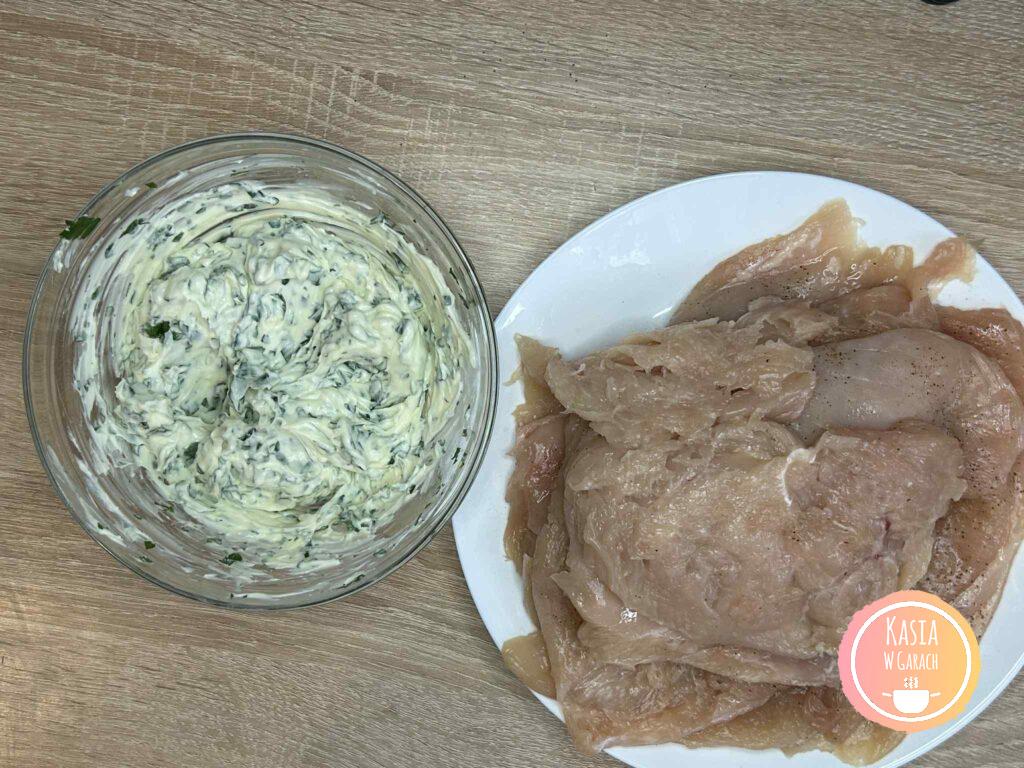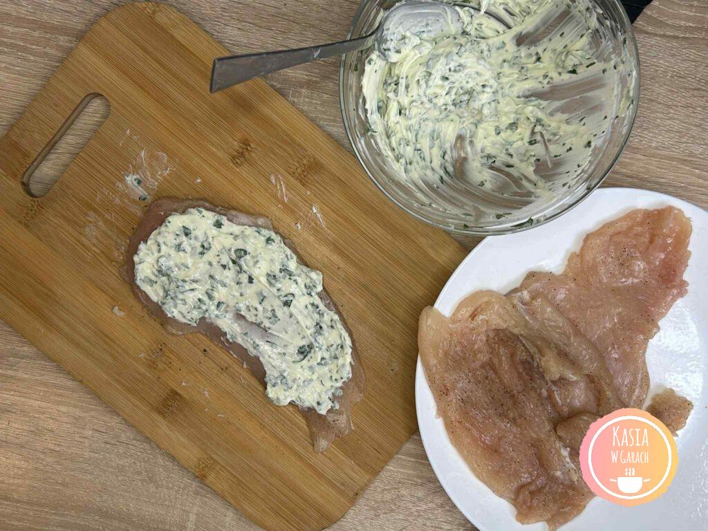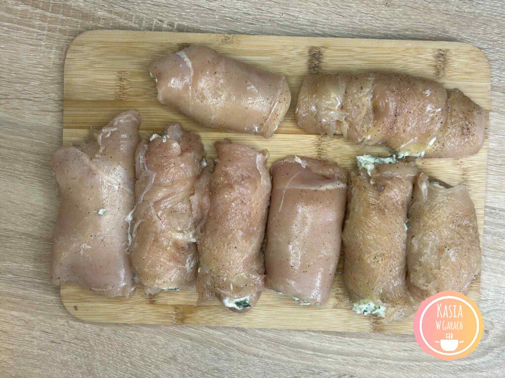 - na każdy plaster mięsa wykładamy porcje serka i rozsmarowujemy go dokładnie po każdym plastrze. Zwijamy w rulon.