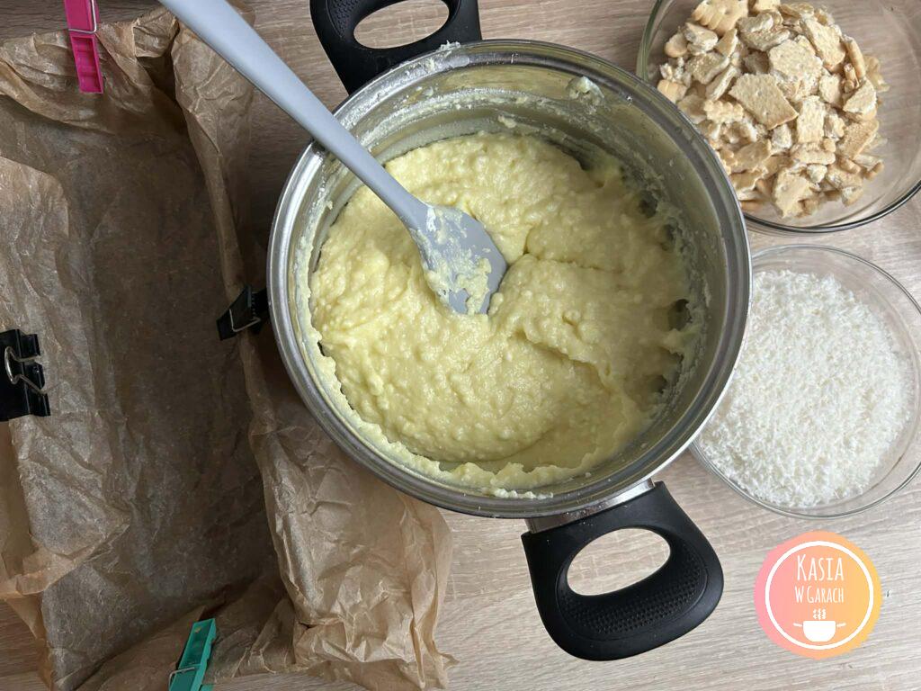 - kolejno wsypujemy wiórki kokosowe i herbatniki. Dokładnie mieszamy.