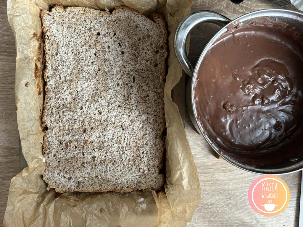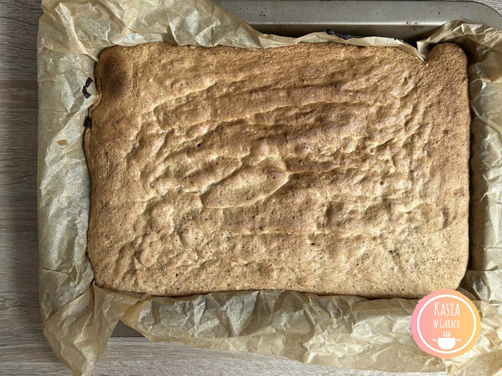 • wystygnięte ciasto wyciągamy z blaszki i odklejamy od papieru. biszkopt przekrajamy na pół.