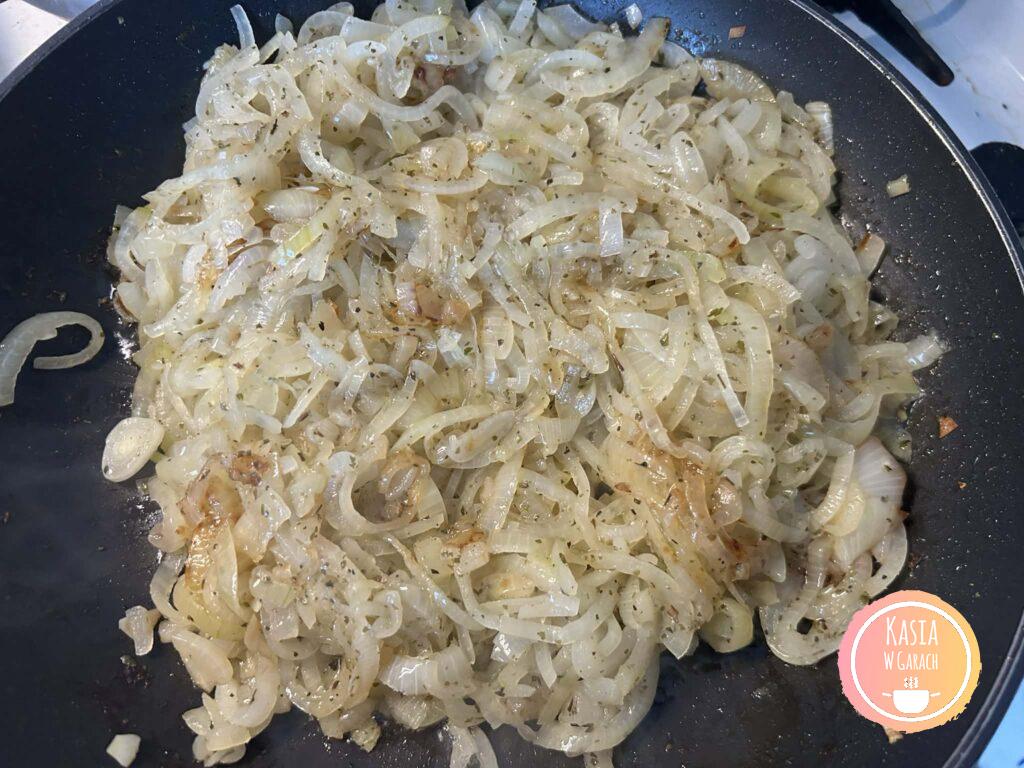 - cebulę kroimy w cienkie półplasterki, podsmażamy na smalcu z przyprawami. Gdy cebula się zeszkli i lekko poddusi przekładamy ją i równomiernie rozprowadzamy po blaszce lub naczyniu żaroodpornym.