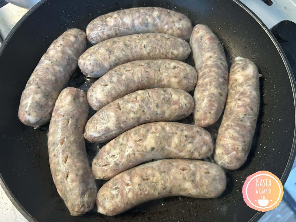 - surową białą kiełbasę nakłuwamy nożem z obu stron w kilku miejscach i podsmażamy na rumiano z obu stron na patelni na smalcu.