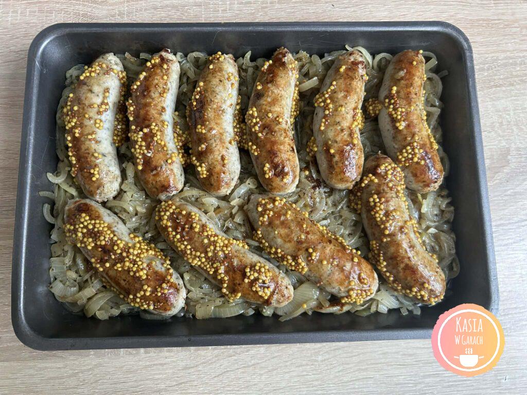 - podsmażoną kiełbasę układamy na cebuli, dociskając ją do dna blaszki tak aby boki kiełbasy byly zanurzone w cebuli i każdą smarujemy ok 1/2 łyżeczki musztardy francuskiej,
