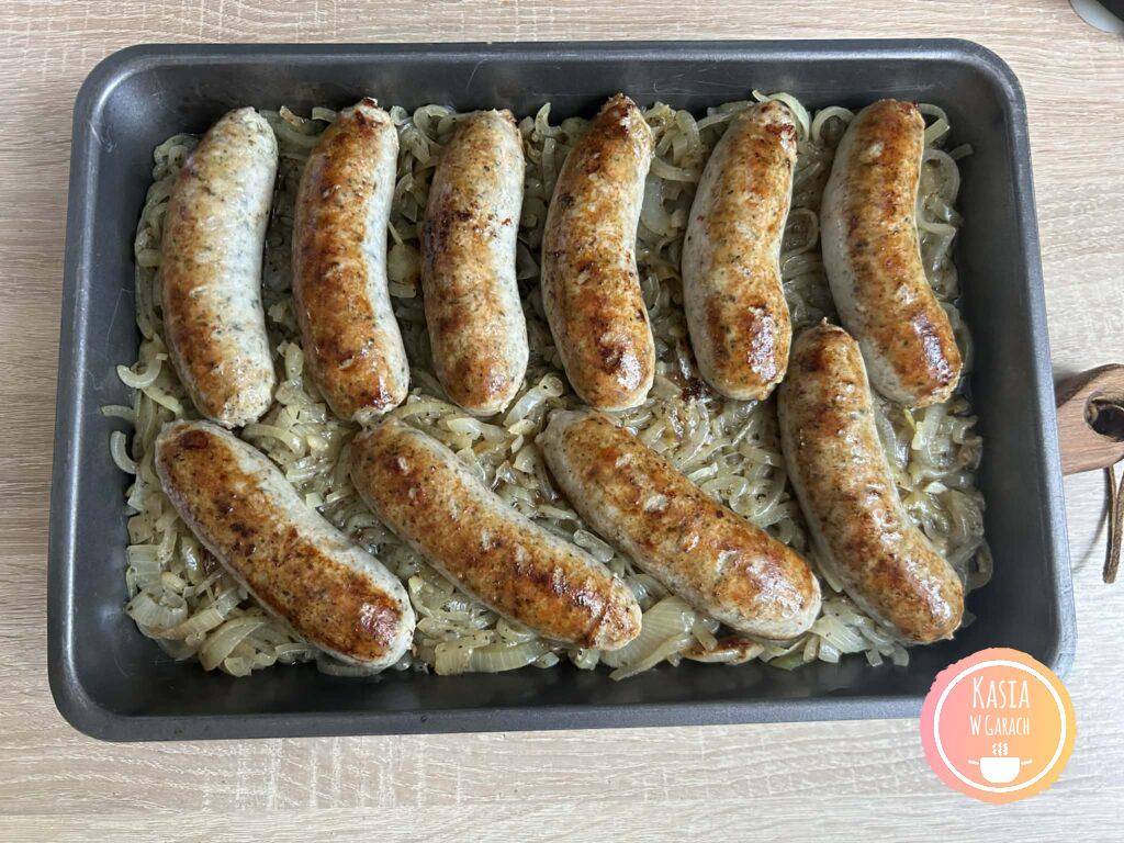 - Pieczona Biała kiełbasa na cebuli u mnie zawsze podawana jest z ugotowanymi ziemniakami i surówką z kiszonej kapusty.