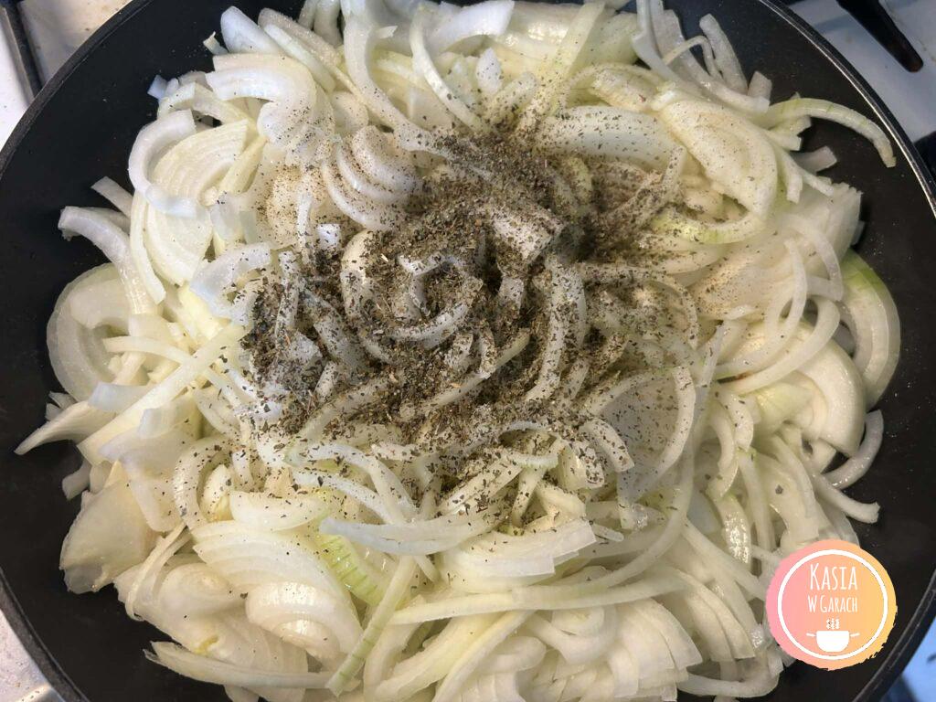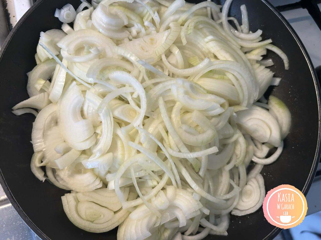 - cebulę kroimy w cienkie półplasterki, podsmażamy na smalcu z przyprawami. Gdy cebula się zeszkli i lekko poddusi przekładamy ją i równomiernie rozprowadzamy po blaszce lub naczyniu żaroodpornym.