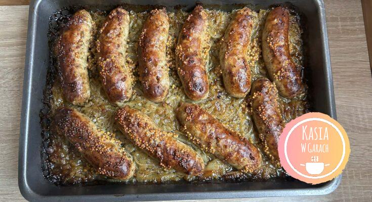 - podsmażoną kiełbasę układamy na cebuli, dociskając ją do dna blaszki tak aby boki kiełbasy byly zanurzone w cebuli i każdą smarujemy ok 1/2 łyżeczki musztardy francuskiej,