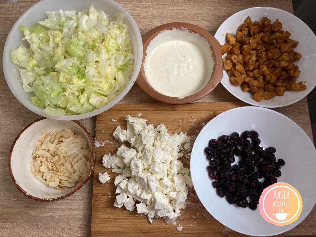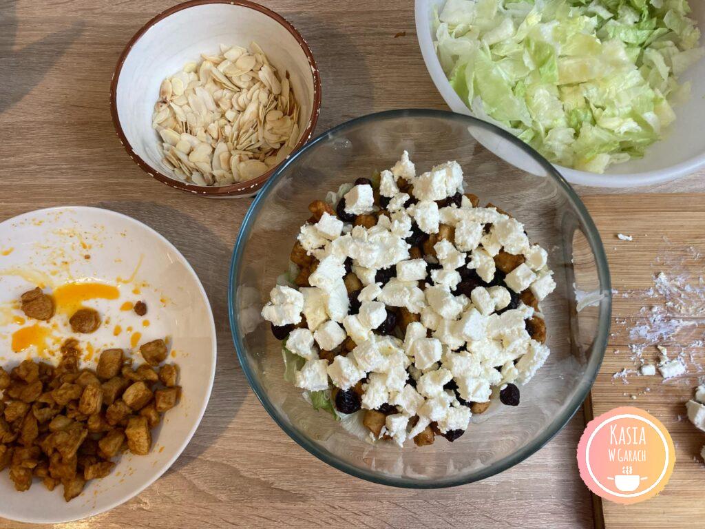 - Na dno miski wykładamy połowę sałaty, polewamy połową sosu. Następnie układamy połowę kurczaka, sera, żurawiny i migdałów.