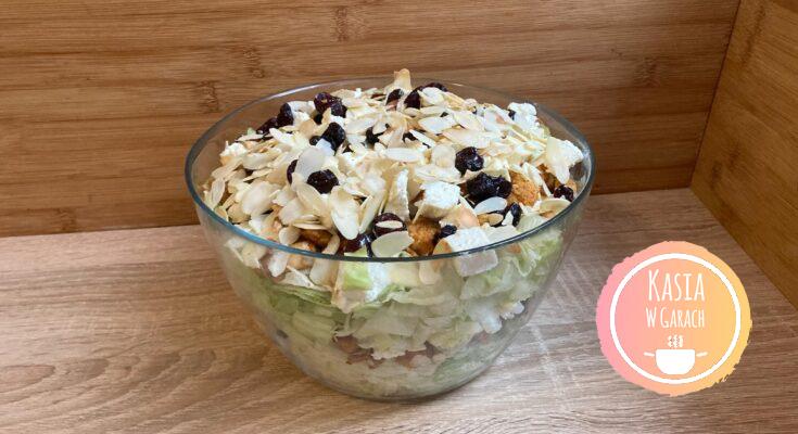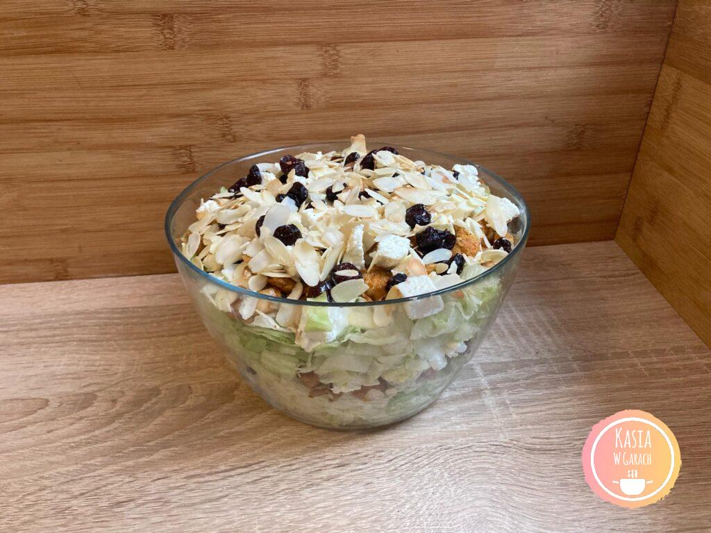 - Układamy pozostałą połowę sałaty, sosu, kurczaka, sera, żurawiny. Po wierzchu posypujemy pozostałymi migdałami.