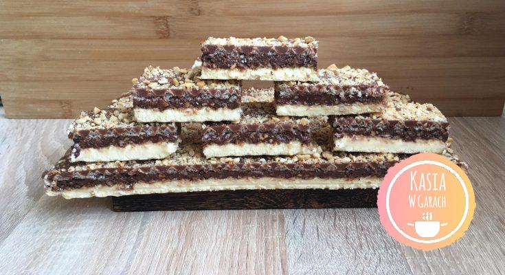 - na drugim płacie rozsmarowujemy masę czekoladowo-orzechową, przykrywamy ostatnim płatem wafla, lekko dociskamy,
