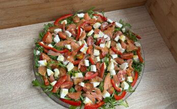 Sałatka z wędzonym łososiem z sosem miodowo-musztardowym. Idealna na lekką kolację lub wyśmienita imprezowa przekąska. Szybka i prosta w przygotowaniu. Z dosłownie kilku składników. Najlepiej smakuje podana z grzankami czosnkowymi. …